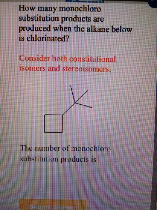 How many monochloro substitution products are produced when the alkane below is chlorinated? Consider both constitutional isomers and stereoisomers. 2. 85 bought 3. How many monochloro substitution products are produced when the alkane below is chlorinated?